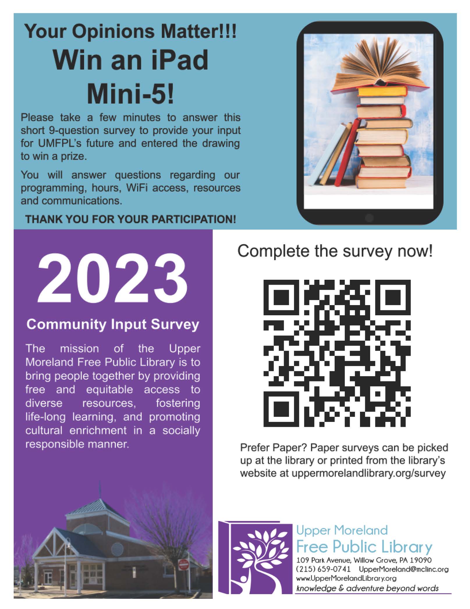 Share your thoughts and priorities as the Upper Moreland Free Public Library sets future goals as part of our strategic planning process. Answer a short survey at Upper Moreland Library Survey